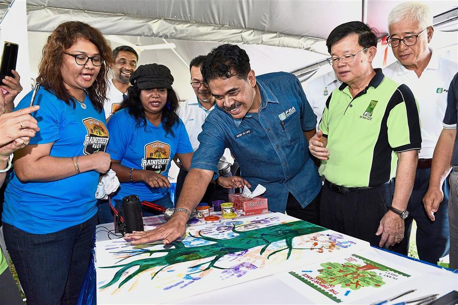 Showing support: Chow (in green) and Jaseni (in blue) leaving their handprints at a booth at the World Water Day 2018 event in Penang City Park.